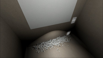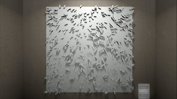 The button makes the artwork interactive, and after all the elements have fallen, the camera pans down and shows a second artwork that has just been created by chance.