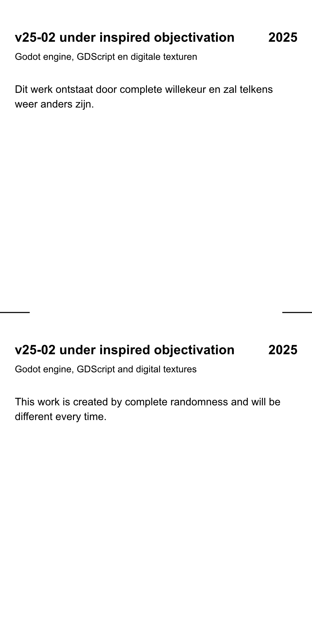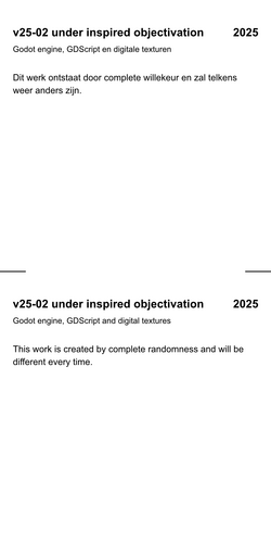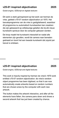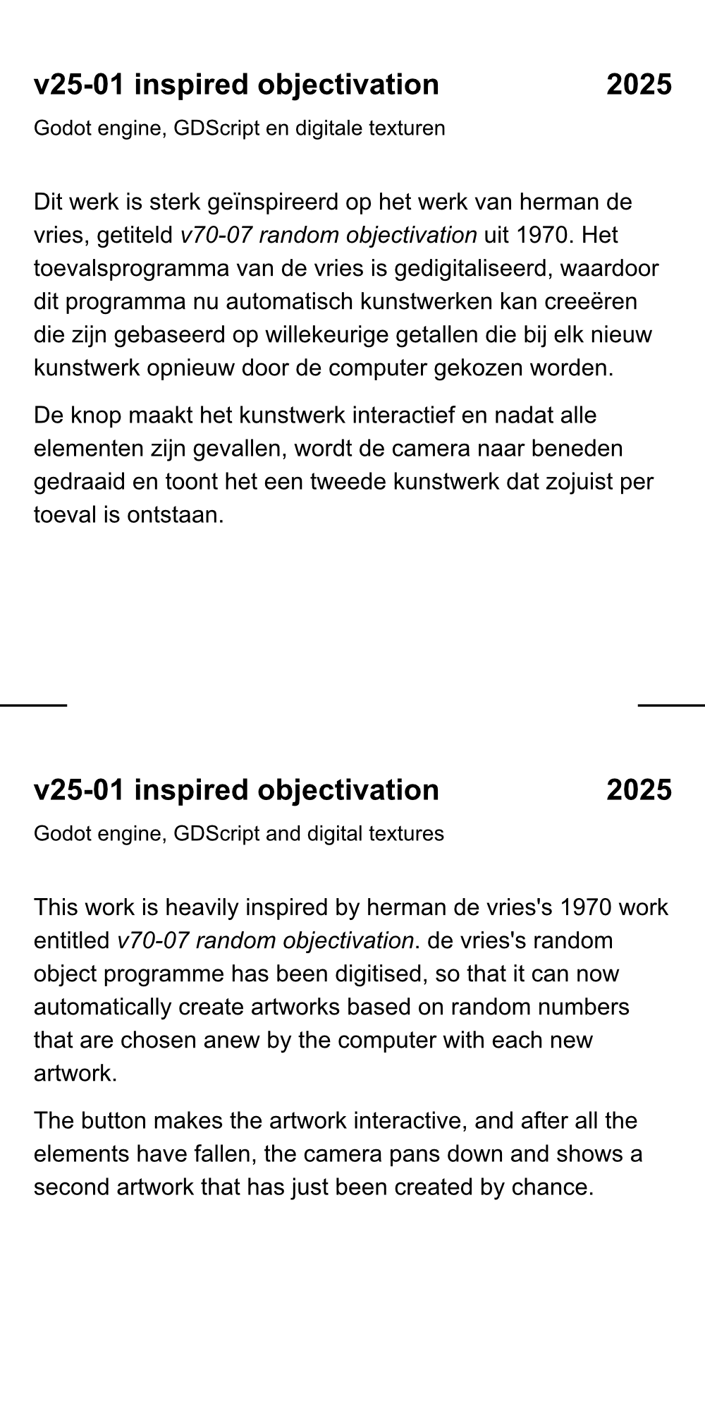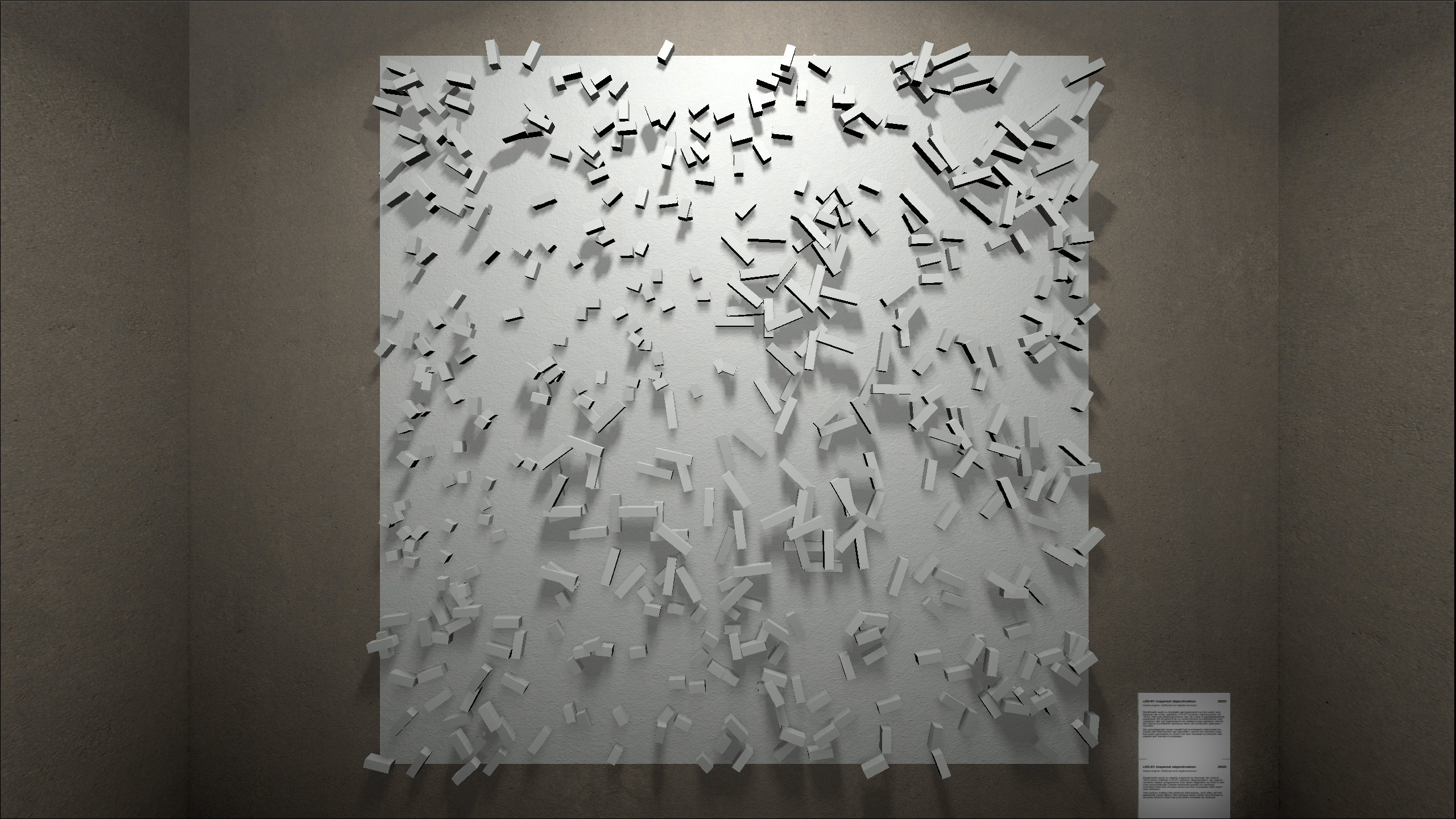 This work is heavily inspired by herman de vries's 1970 work entitled v70-07 random objectivation. de vries's random object programme has been digitised, so that it can now automatically create artworks based on random numbers that are chosen anew by the computer with each new artwork.
